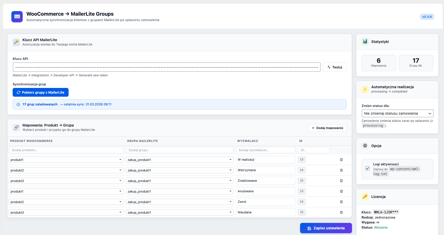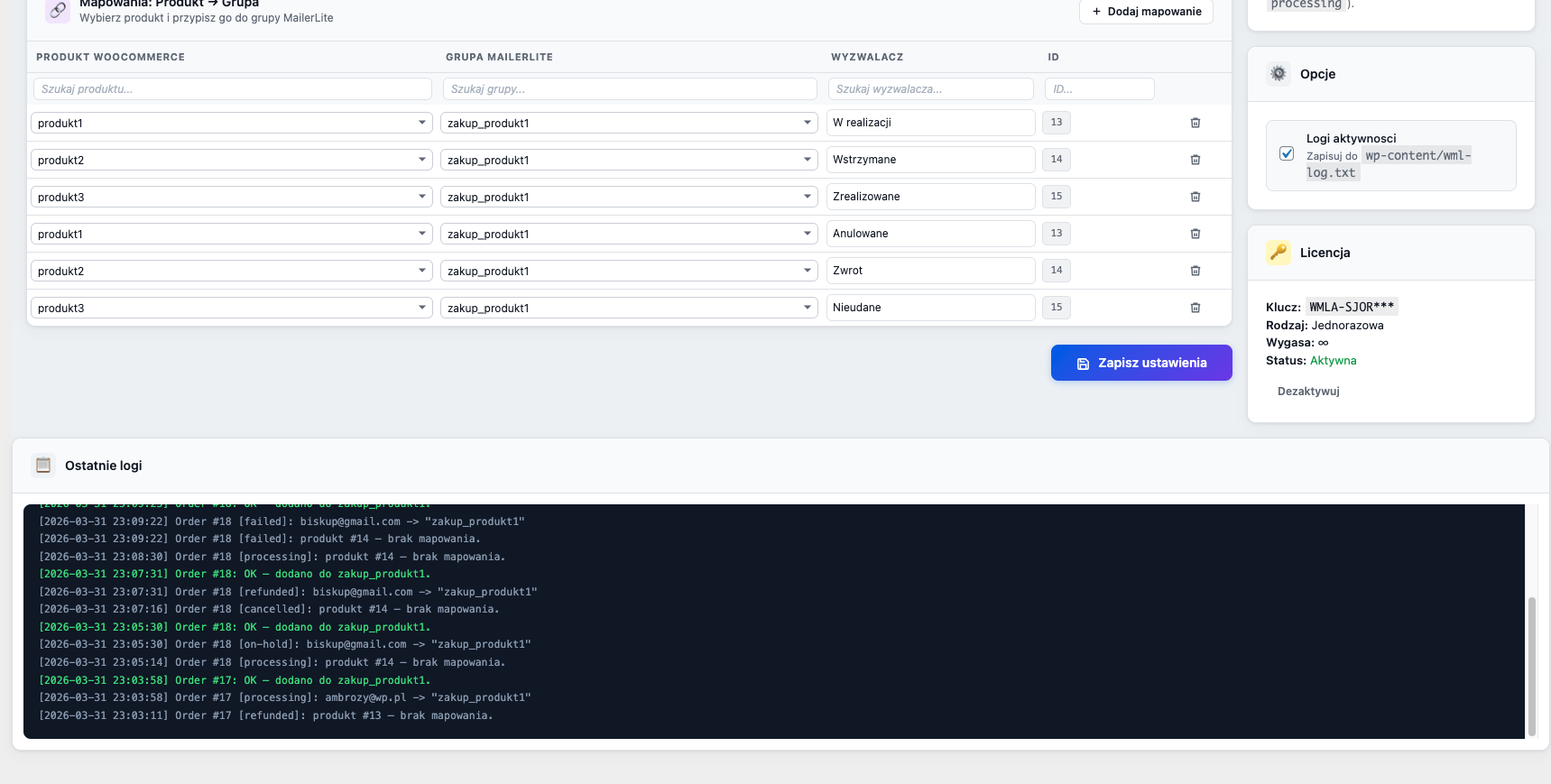 Konfiguracja bez pisania kodu. Łączysz konto MailerLite, definiujesz które produkty trafiają do których grup i gotowe.